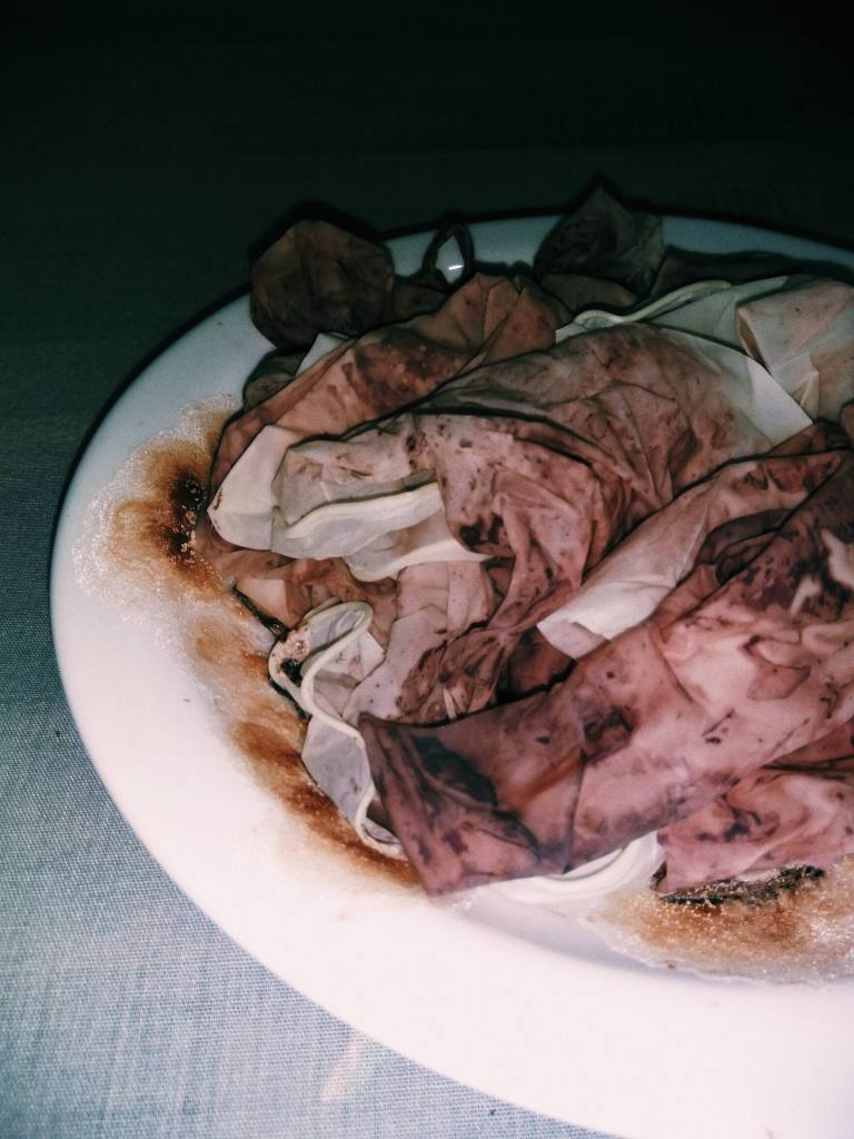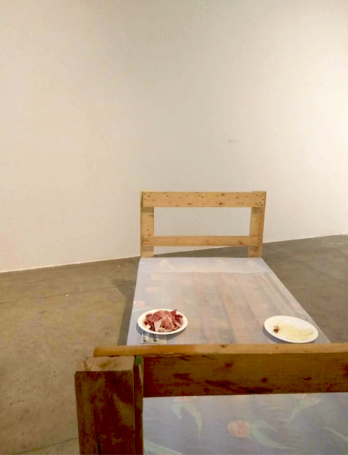 Madeira, vidro, corante, sal, luva de látex, tecido e impressão em guardanapo. 88 x 90 x 194 cm